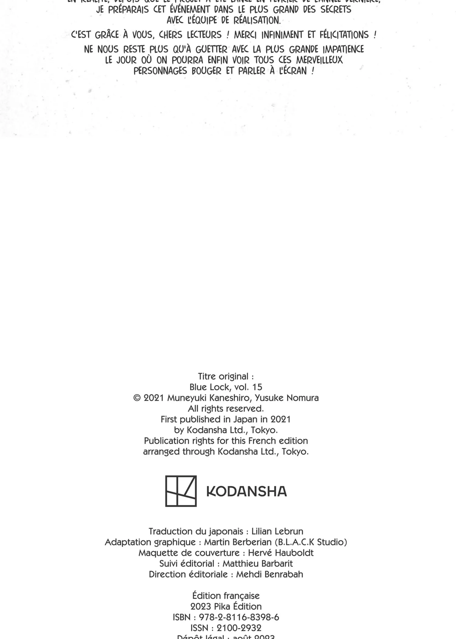 Lisez le dernier manga Blue Lock [Version officielle] Tome 15 sur SushiScan. Le manga Blue Lock [Version officielle] est toujours mis à jour sur SushiScan. N'oubliez pas de lire les autres mises à jour de manga. Une liste de collections de manga SushiScan se trouve dans le menu Liste de manga.