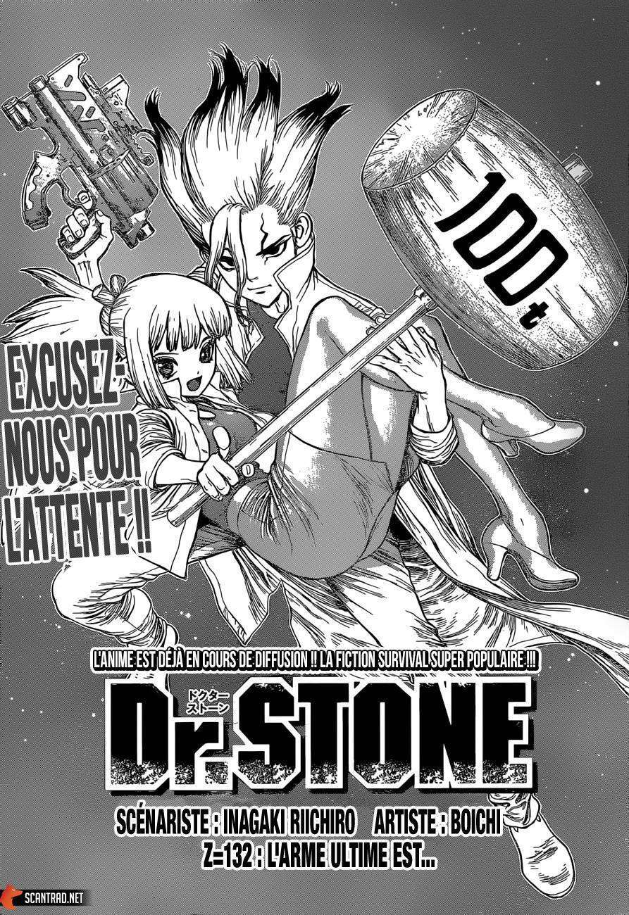 Lisez le dernier manga Dr. Stone Chapter 132 sur SushiScan. Le manga Dr. Stone est toujours mis à jour sur SushiScan. N'oubliez pas de lire les autres mises à jour de manga. Une liste de collections de manga SushiScan se trouve dans le menu Liste de manga.