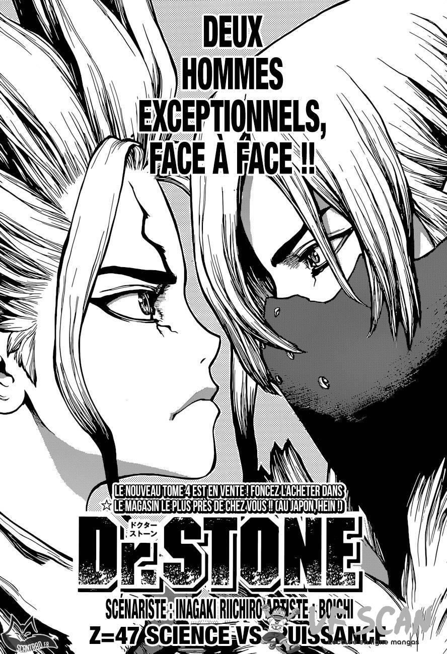 Lisez le dernier manga Dr. Stone Chapter 47 sur SushiScan. Le manga Dr. Stone est toujours mis à jour sur SushiScan. N'oubliez pas de lire les autres mises à jour de manga. Une liste de collections de manga SushiScan se trouve dans le menu Liste de manga.